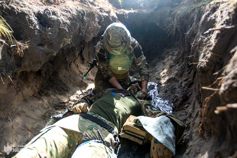 Паралельно з цим курсанти відпрацьовують дії під час занять із бойової системи виживання воїнів та тактичної медицини. Зокрема, вони тренуються евакуювати поранених із поля бою силами евакуаційної групи, відпрацьовують зупинку масивної кровотечі у зоні під вогнем (CUF), після чого переміщують умовно поранених до зони тактичної допомоги (TFC).